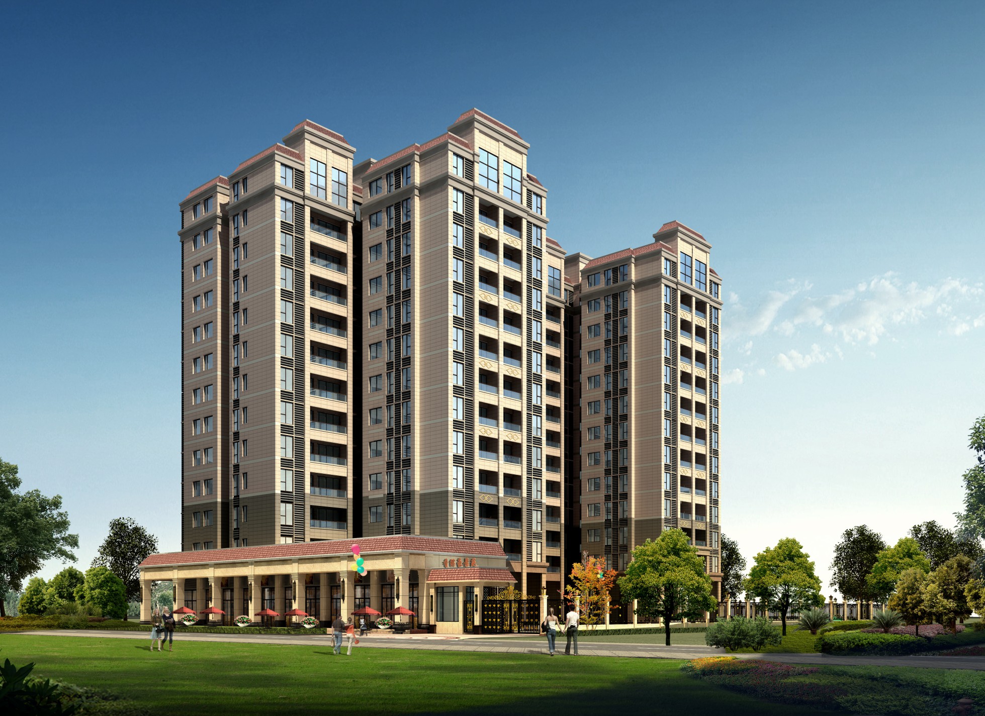 社區(qū):中央噴泉水景、兒童游樂(lè)區(qū)、迎賓漫道