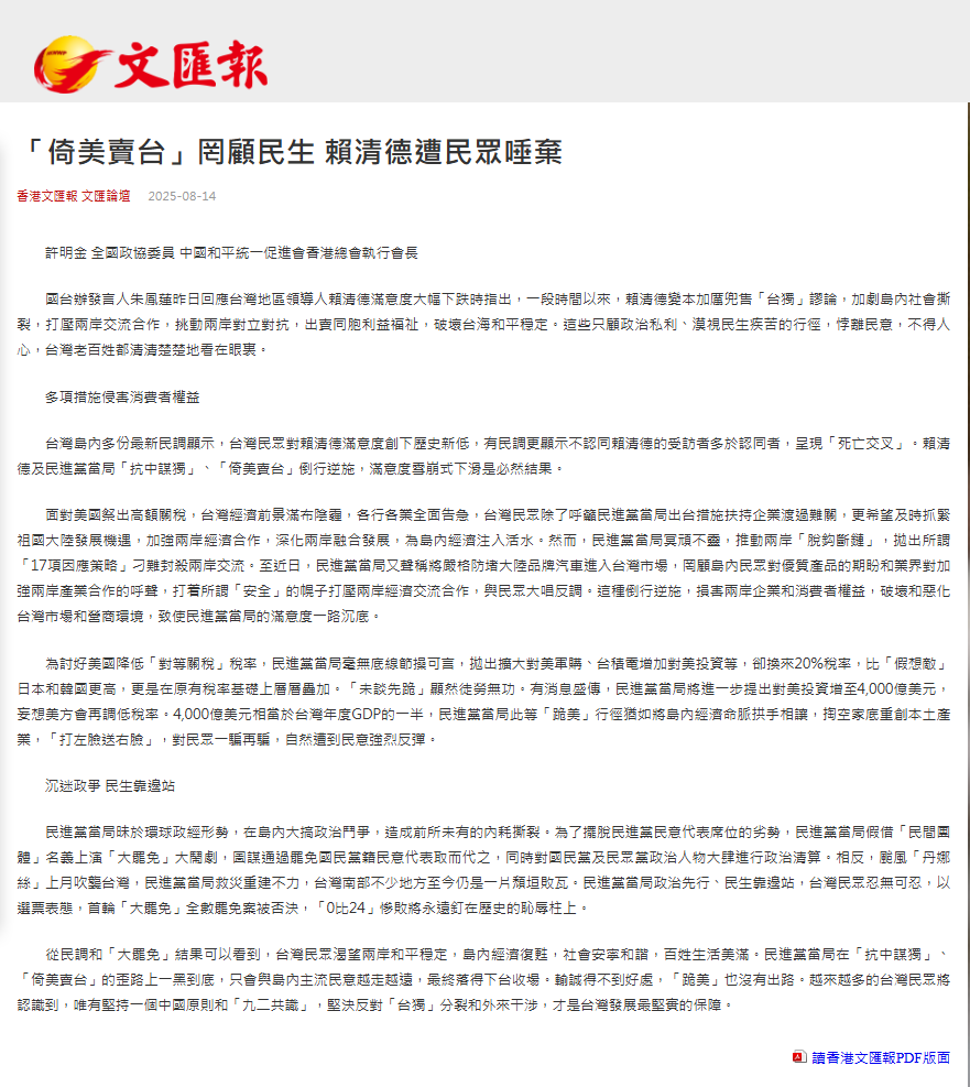 2025年8月14日,全國政協(xié)委員、廣東省福建商會(huì)會(huì)長、中國和平統(tǒng)一促進(jìn)會(huì)香港總會(huì)執(zhí)行會(huì)長、集團(tuán)董事局主席許明金,在香港《文匯報(bào)》發(fā)表了“「倚美賣臺(tái)」罔顧民生 賴清德遭民眾唾棄”的文章。